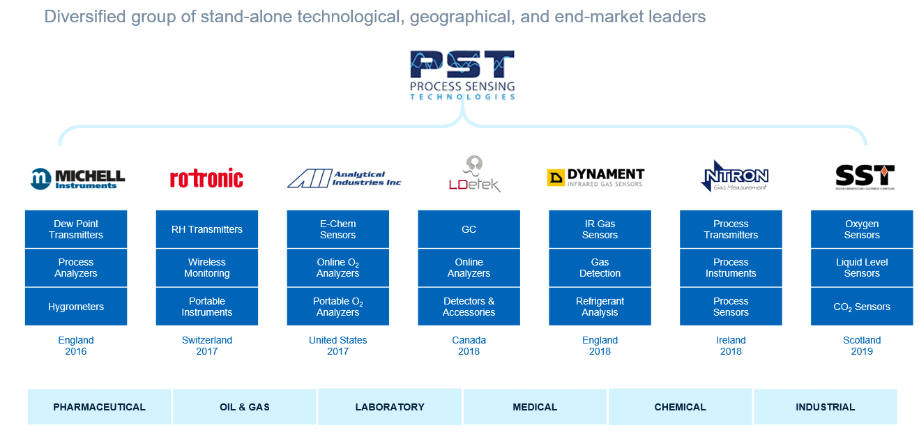 - Following the introduction of Markin to PST, Battery sourced and executed six additional proprietary acquisitions across multiple geographies (U.S., Canada, Switzerland, England, Ireland and Scotland) to create a global platform. Current brands operating under the PST umbrella include Analytical Industries, Dynament, LDetek, Michell Instruments, NTRON, Rotronic and SST Sensing Ltd.