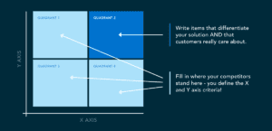 Here’s the fun part—you get to define what the X and Y axis criteria are. You are writing the story! This helps you focus the sales narrative on why you’re different. Now teach your sales team to bang their hand on the table while they explain this box in their hook.