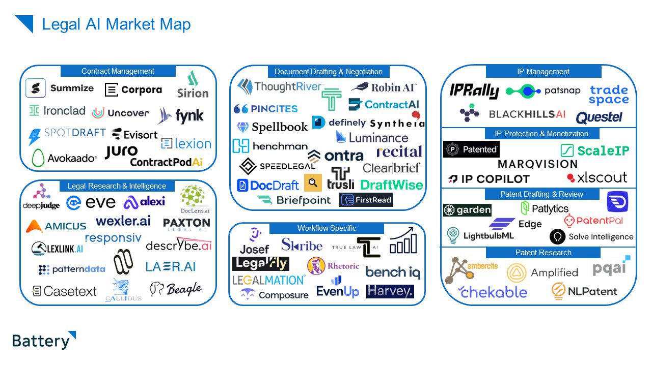 Ontra*, a Battery portfolio company in the AI-contracting space, uses AI to handle the initial 90% of the contract process, with their Ontra Legal Network serving as the human-in-the-loop to finalize contracts for private market clients. We see significant opportunities in this segment for startups to differentiate by focusing on different buyer personas (e.g., biglaw, midlaw, solo) and contract types (from bespoke, highly complex negotiations to high-volume, simple agreements).