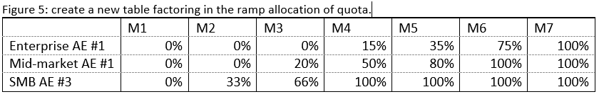 BB: Build a spreadsheet with rows for your different types of quota-carrying reps and the number of those reps you plan to hire. This can be by segment, by geography, by vertical of the different types of AE’s you have. The goal is to determine how fast you’ll get quota onto the street to be able to make your plan.