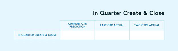 One additional metric to consider is in-quarter create and close (IQCC). Some companies have relatively fast sales cycles (less than 90 days) and need to track this metric outside of the conversion X pipeline metric. Since these deals are born and closed all within the same quarter, they may not have been created yet and therefore aren’t factored into pipeline. Track this metric in addition to your pipe X conversion metric, as you’ll want to use some historical create and close to predict future quarters. If you close 20-25% of your quarterly business as IQCC, you’ll want to include a calculation for this in your forecast.
