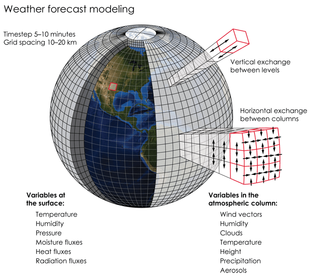 Taking a step back, it’s clear that atmospheric science has made enormous strides since the first “numerical weather prediction” (NWP) models were conceived in the 1950s. Though weather is stochastic to the core, the well-understood physical laws of hydrodynamics long have been applied to predict the weather with useful near-to-midterm accuracy. Instantiating these laws in predictive models requires simulating the earth’s atmosphere as a three-dimensional grid of cells exchanging energy and moisture from observed starting conditions. This requires some of the most complex and demanding computational workloads in existence.