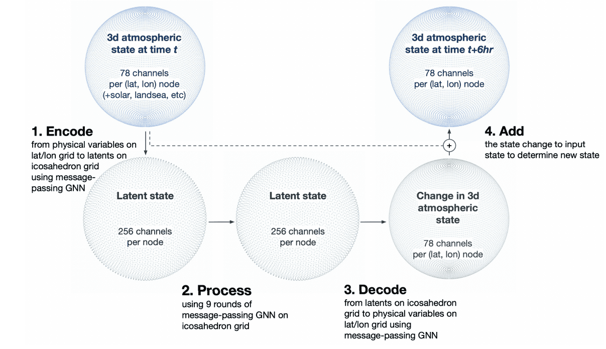 A figure from Forecasting Global Weather with Graph Neural Networks (Ryan Keisler, PhD) showing a Coder → Processor → Decoder approach for weather prediction using neural networks.