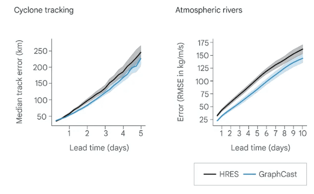 Early indications for new, ML-based forecasting approaches are encouraging. DeepMind reports its GraphCast model produces more accurate predictions than the ECMWF’s leading HRES model on over 90% of 1,380 test variables and forecast lead times, and Nvidia claims its FourCastNet model can compute forecasts orders of magnitude faster (and thus cheaper) than ECMWF models with comparable or superior accuracy.
