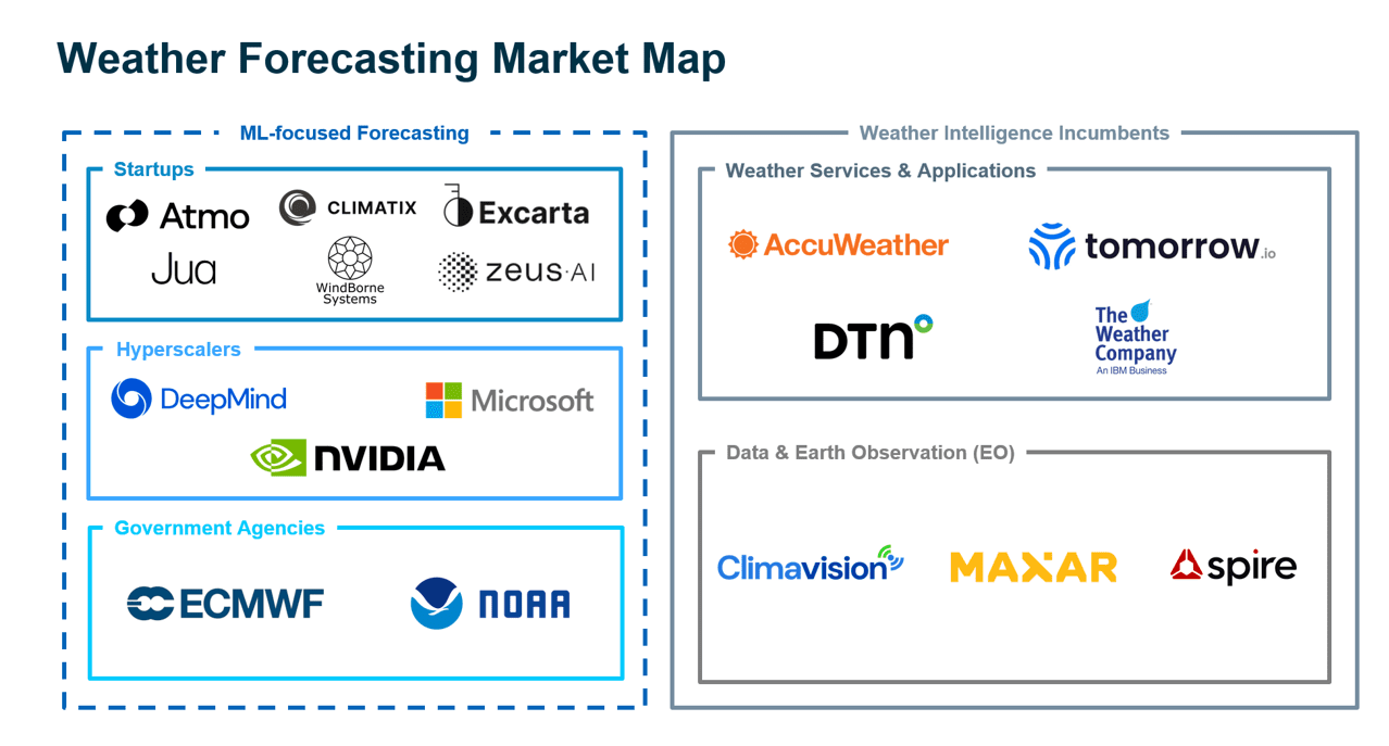 Newer vendors like Atmo, Zeus AI, and WindBorne Systems similarly claim their ML models offer greater accuracy and granularity than incumbent NWP models. Other companies are providing ML weather forecasting that is fine-tuned to serve specific use cases, such as Jua (for energy trading) and Excarta (for insurance and solar).