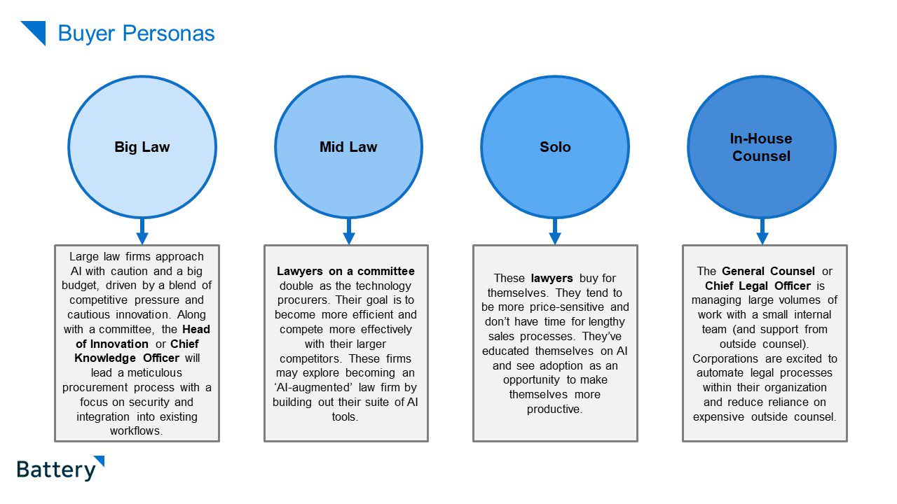It’s crucial to recognize that the legal AI market is diverse, with distinct buyer personas possessing unique needs, challenges and decision-making processes. Startups targeting large law firms should be prepared to collaborate closely with IT departments and tailor features to each client’s specific workflows. Conversely, startups serving small law firms may find success with a product-led growth strategy that minimizes onboarding requirements.