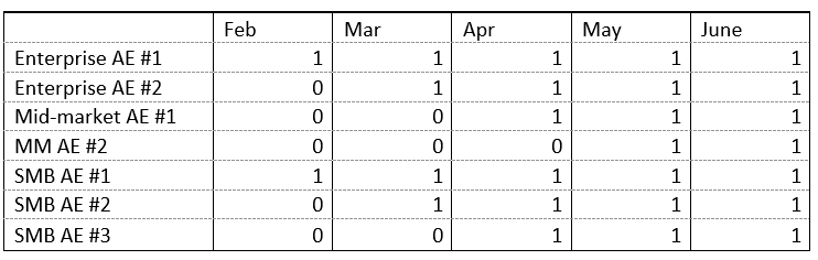 BB: Yes, a good next step is to determine what quotas the different roles will carry. For instance, most SMB AE’s tend to carry lower quotas than their Enterprise peers. You would also factor in any AE’s in different geos or different verticals here.
