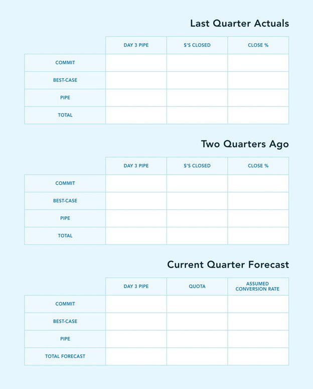If you’re tracking by forecast category, your $3M of initial pipeline was probably more like $600K of committed pipeline, $1.5M of best-case, and $900K of upside. It’s likely you’ll see a higher conversion rate against the committed category, and then a lower conversion rate against best-case, and then dropping further from there. The more detailed you can be, the better you can become at predicting your future quarters. Ideally you want to build consistency on your conversion rates each quarter.
