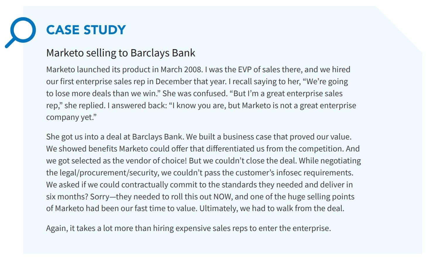 The goal of this questionnaire is to reinforce the fact that the move to the enterprise is indeed a company-wide mission. The three examples in questions two to four are all OUTSIDE of sales—— they are about operations, customer service and legal. Sales and marketing are the heavy lift. So if you don’t have the functions that surround sales and marketing in a good spot, you’re going to face blockers.